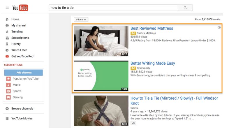 搜索推荐广告不仅可能出现在你的YouTube主页,还可能出现在搜索页、相关视频页。