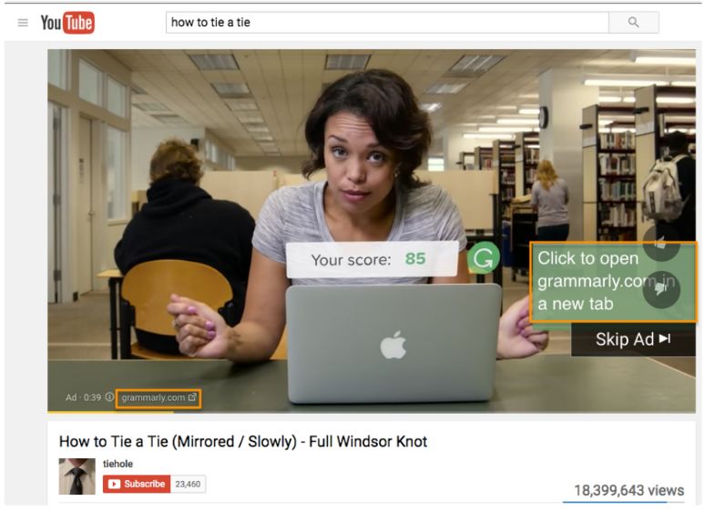 而贴片广告一般都在视频播放前出现,并且投放者可以在广告上覆盖行动召唤按钮,比如Grammarly这个广告,从而使用户可以直接访问官网。