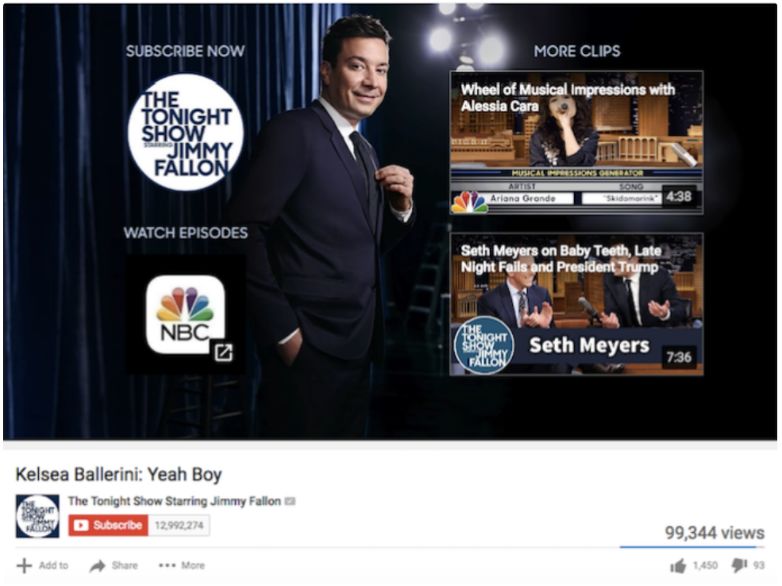 不管是什么样的YouTube频道,片尾模板都能帮你提升观众对品牌的兴趣。如果观众觉得你的片尾好看,那就很可能会进行点赞、订阅等行为,比如Jimmy Fallon脱口秀的这张片尾模板,就既宣传了视频,也宣传了电视台的手机app。