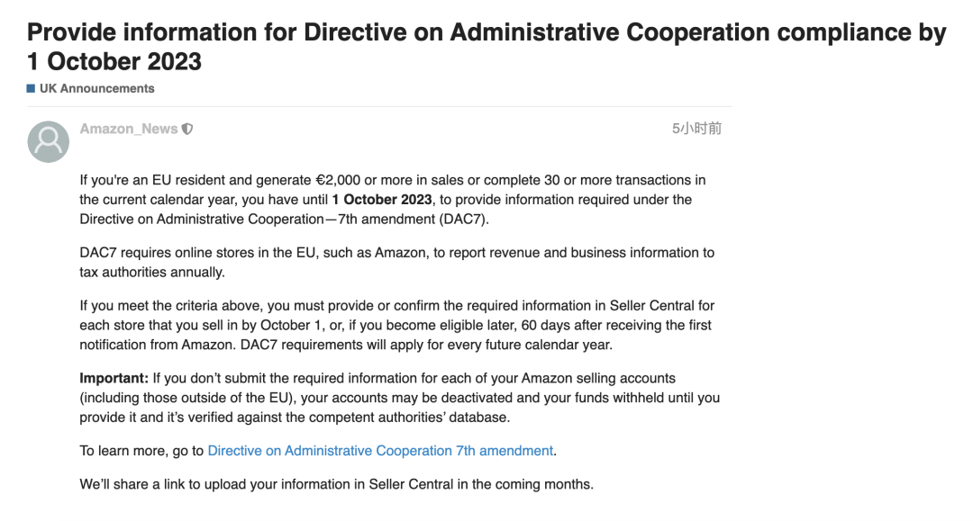 亚马逊表示,如果你的公司是欧盟本土公司,并且在今年内产生了不低于(包含)2000欧元的销售额或完成了30笔及以上的订单交易,那么就必须在2023年10月1日之前提供行政合作指令-第七修正案(DAC7)所要求的信息。