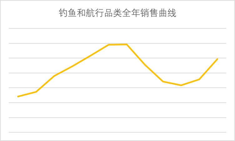 钓鱼的季节性相对明显(参考下图,数据参考亚马逊美国站销售)。每年夏季6月和7月是旺季,而天气冷的时候销量显著下降,11和12月的Holiday Season会带来一个小回升。但所谓渔猎是一家,钓鱼和打猎运动的爱好者群体比较重合,并且季节上刚好互补,其实卖家朋友们也可以考虑把两个运动结合起来发展。另外亚马逊澳洲站处于南半球,季节和北半球相反,也给卖家提供了一个很好的季节性互补。