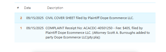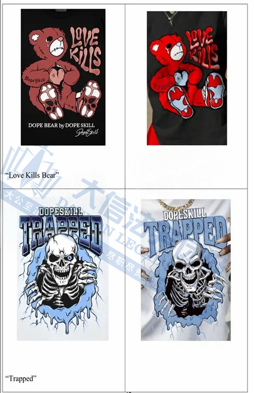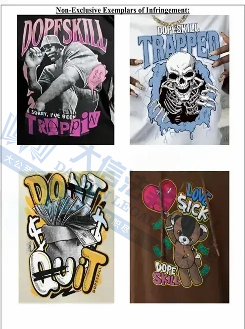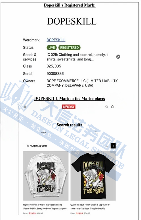 此案为商标+版权维权,目前已涉及数十名卖家被告,涉案商标:Dopeskill以及版权作品,以下是涉及案件的具体信息,未经授权不得擅自使用,侵权风险极高,跨境卖家尤其是服装卖家尽快检索下架,避免TRO侵权风险!