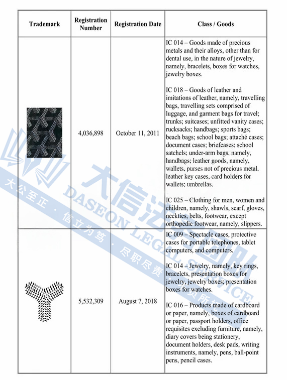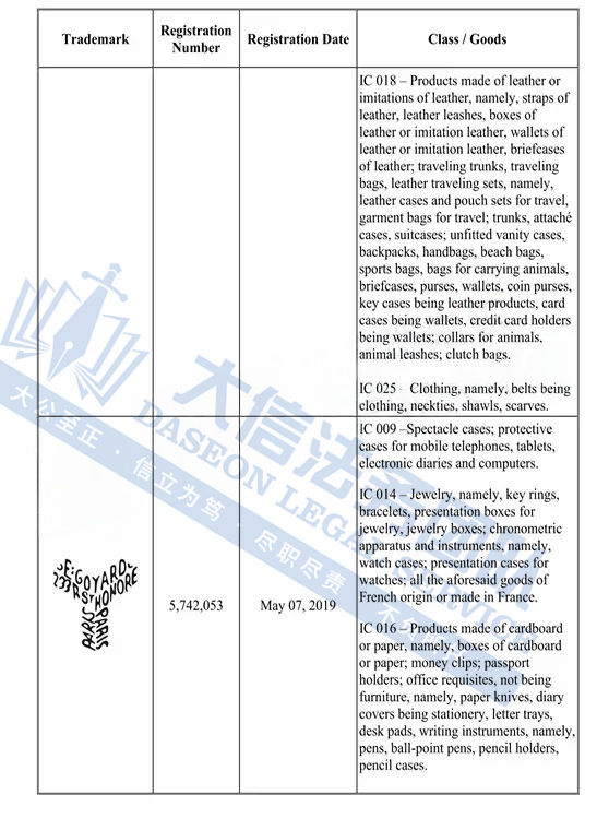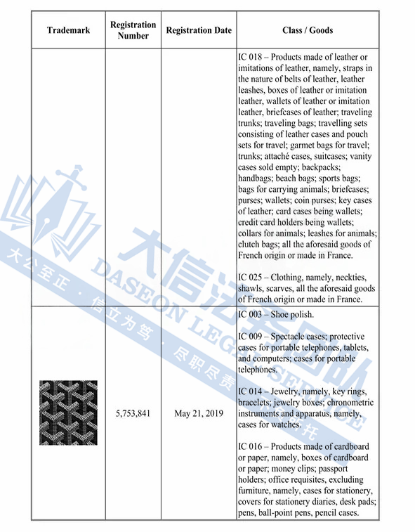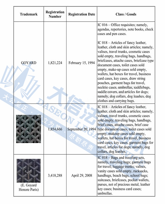 原告是来自法国的奢侈品牌,创立于1853年,最初是一家专为贵族和上流社会定制旅行箱包的家族工坊。品牌以精湛的手工艺、低调的奢华风格和高度私密性闻名,其最具代表性的特色是经典的「Goyardine」帆布图案—由交织的“Y”字母组成,象征创始家族姓氏 Edmond Goyard。这种图案全部采用手工绘制,具有极高的辨识度。