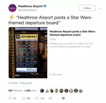 Heathrow机场在星球大战日推出了星球大战版登机牌,这一活动在网络上迅速受到热了追捧和关注,