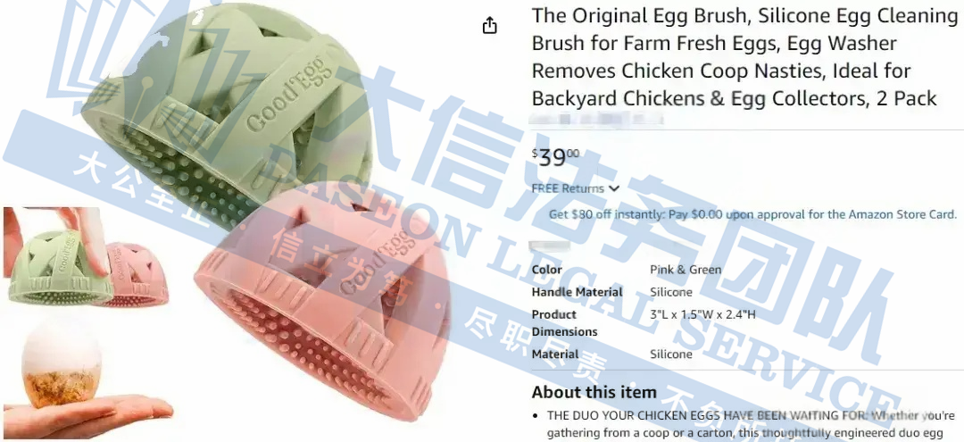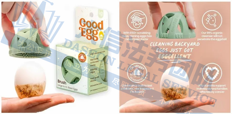原告是由一对美国夫妻Amy和Bryce因农场生活需求而创立的创新型家居产品公司,灵感源于对家庭园艺与自给自足生活方式的热爱。针对传统洗蛋效率低、易破壳的痛点,品牌推出全球首款专用蛋刷——GoodEgg 旋转式蛋刷。食品级硅胶刷头柔韧贴合,数百个立体凸点深入蛋壳纹理,数秒即可带走粪土污渍,彻底告别破损风险,让原本繁琐的家务变得简单快捷。