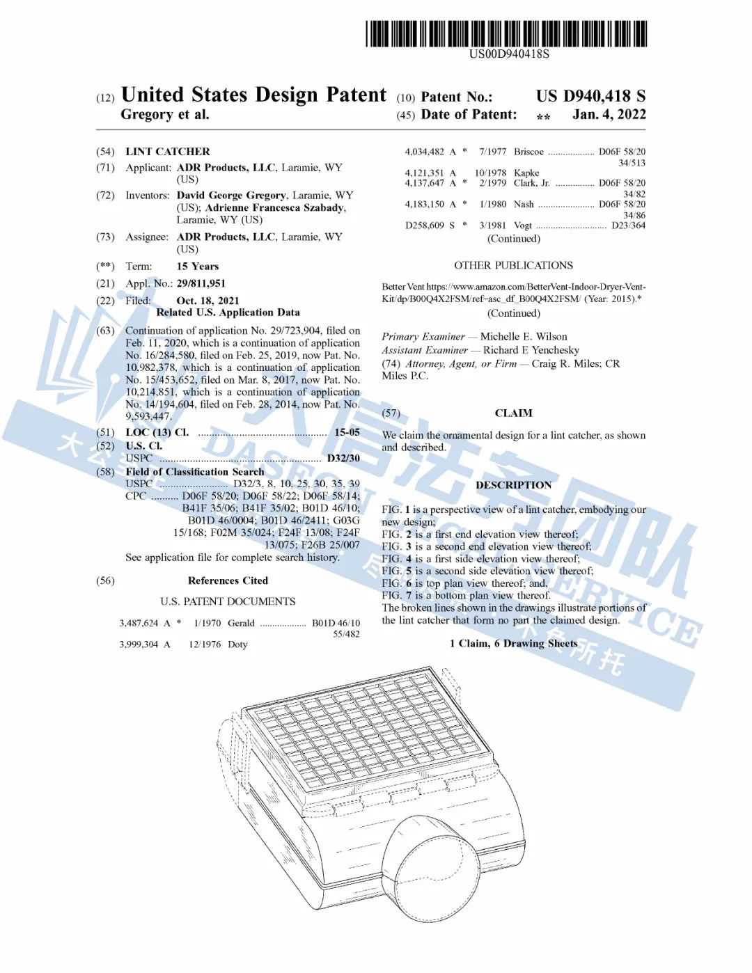 此案为专利维权,涉及2项专利,专利号:11479904和D940418,分别于2022年10月25日和2022年1月4日下证,除此之外,原告还在美国注册了多个专利,专利号分别为:8893399、9593441、10214851、10982378、11479904、D940418、D940979等,注意,原告还注册了BetterVent商标,商标号为:4610268,未经授权均不可擅自使用,侵权风险极高!以下是涉及专利的具体信息,跨境卖家尽快检索下架,避免造成更大的侵权损失!