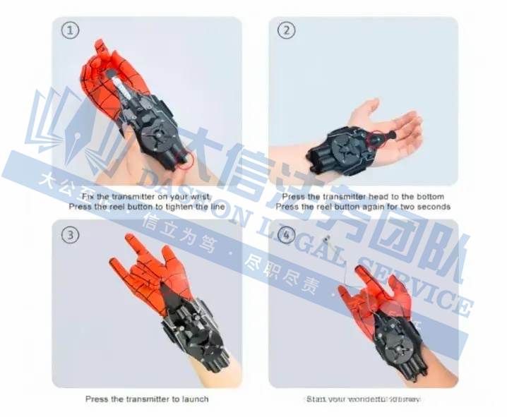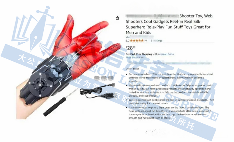 原告是国人卖家,旗下有一款超级英雄蛛网射击玩具,这是一个可以反复启动的网络启动器,具有超级英雄的标志性动作;每个孩子都可以成为超级英雄。轻按发射开关即可射击。带磁铁的头部推出后可以粘附在铁制品上。如果磁铁换成吸盘,头部可以粘附在光滑平坦的物体(如玻璃)上,深受孩子的喜欢。