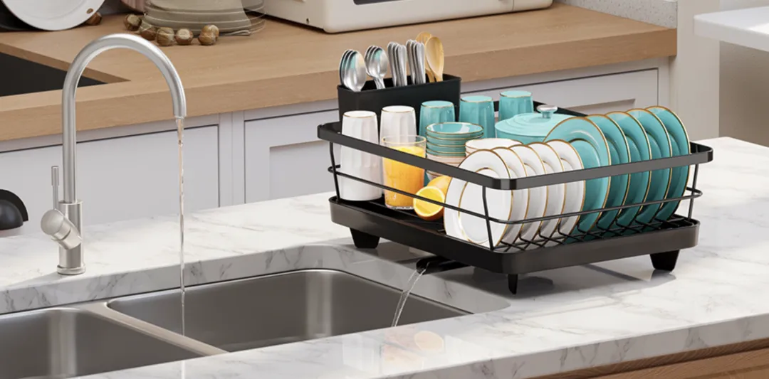 新款碗碟架采用可拆卸的滴水盘,并配备排水通道与可调节喷嘴,能将积水顺畅引导至厨房水槽,实现安全高效的排水;同时,可旋转喷嘴与稳固的连接结构,使其能灵活适配不同的台面布局。