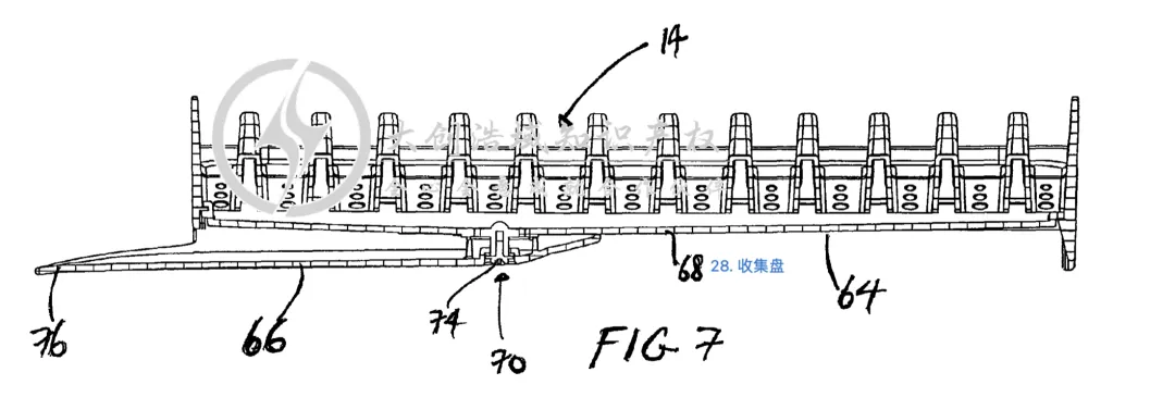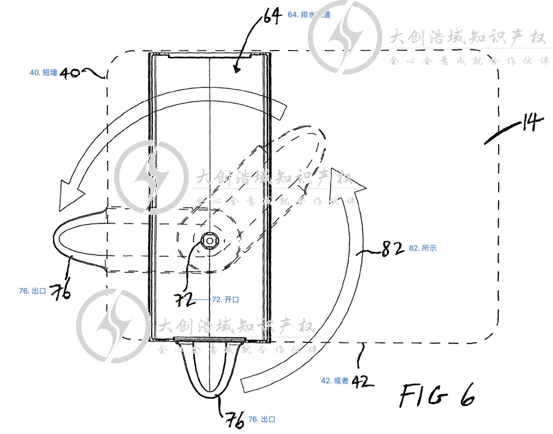 如上图所示,在排放通道64中,排放通道64的底部68从其侧边缘朝着出口70向下成角度,该出口70位于排放通道64的最低点,以允许排水通道64上的水流向出口70;喷嘴66与排放通道64转动连接,并且铰接在出口70的开口72处,也就是说流水从排放通道64经出口70的开口72流向喷嘴66;喷嘴66包括沿轴向敞开的通道76(即非封闭管,类似槽形结构)。
