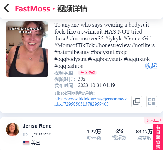 其中,TikTok达人Jerisa Rene在2023年10月31日发布了一个爆款视频,她展示了OQQ上衣对各种身材的修饰效果,包括肥胖的身材。她强调了该上衣的高舒适度,表示穿着它不会感到任何不适,此外,她还提到这款上衣有三种颜色可供选择,并极力推荐大家购买。该视频在TikTok上迅速走红,播放量达1749.63万次,获得49.00万个点赞和4484条用户分享。