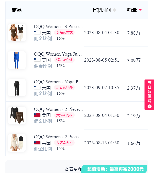 根据FastMoss的数据,TikTok小店OQQ的销量冠军是一款售价为35.09美元的女士紧身上衣,截至目前,该商品总销量为7.93万,总销售额约为268.35万,总关联达人3604个,总关联直播734个,总关联视频1265个。