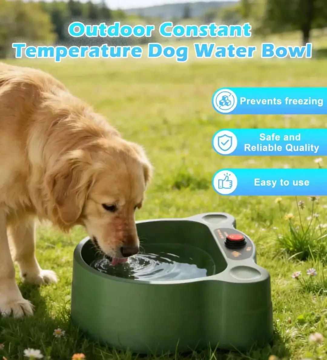 矛盾感: 这个产品是“恒温狗碗”(Constant Temperature)且核心卖点之一是“防止结冰”(Prevents freezing)。然而,背景却是一片阳光明媚、绿草如茵、甚至开着小野花的春夏草地。