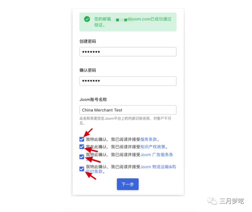 4. 创建密码和账号名称,仔细阅读并确认各项条款,点击下一步。如果后期需要更改账户密码,请联系在线客服或者发邮件到商户邮箱,索取修改密码链接。