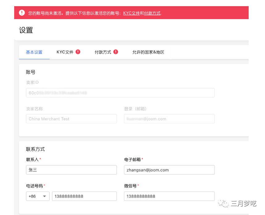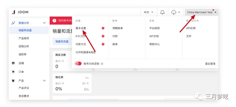 5. 登陆到后台,点击右上角卖家名称,展开菜单中依次完成【基本设置】、【KYC文件】和【付款方式】,红色星号的内容为必填,其他为选填。