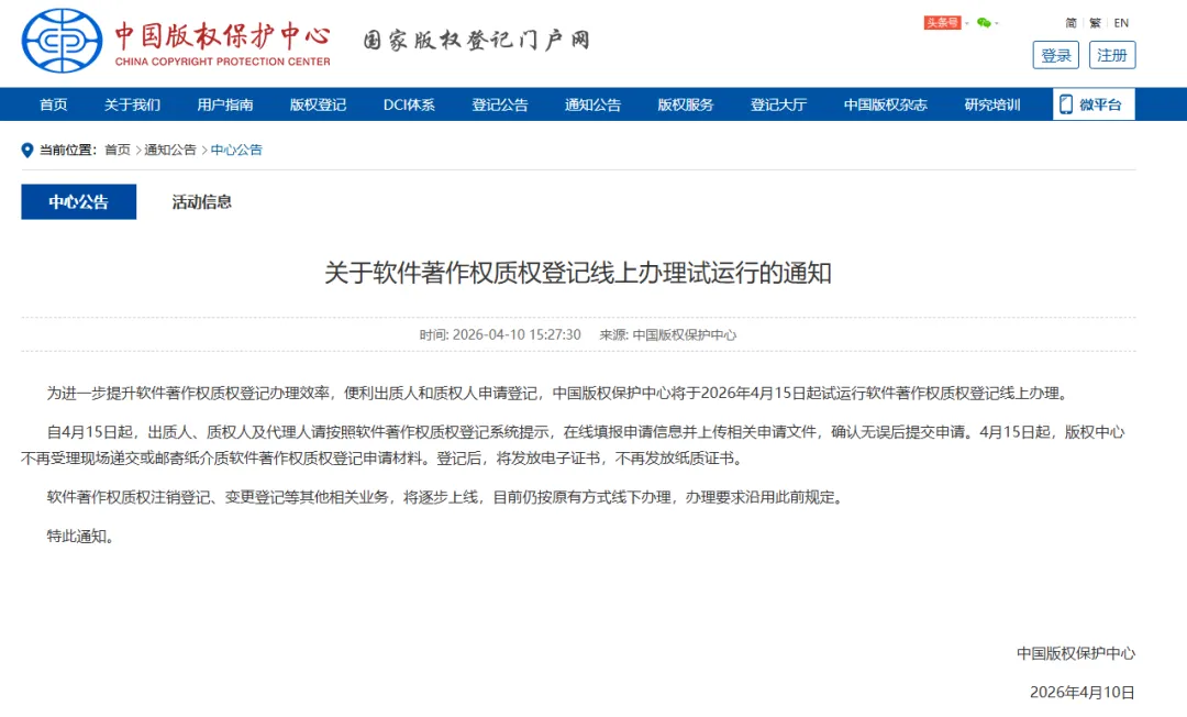为进一步提升软件著作权质权登记办理效率,便利出质人和质权人申请登记,中国版权保护中心将于2026年4月15日起试运行软件著作权质权登记线上办理。