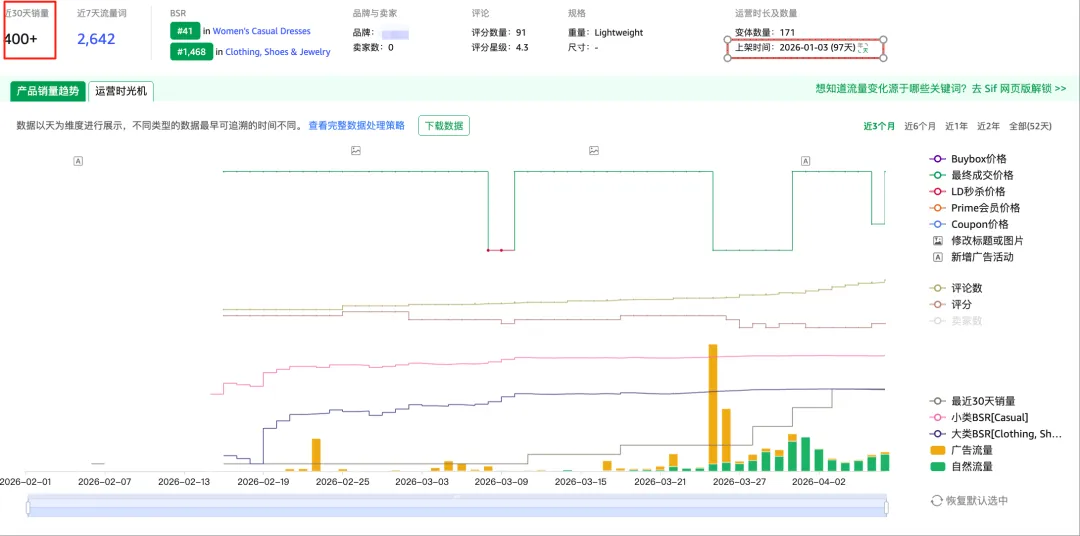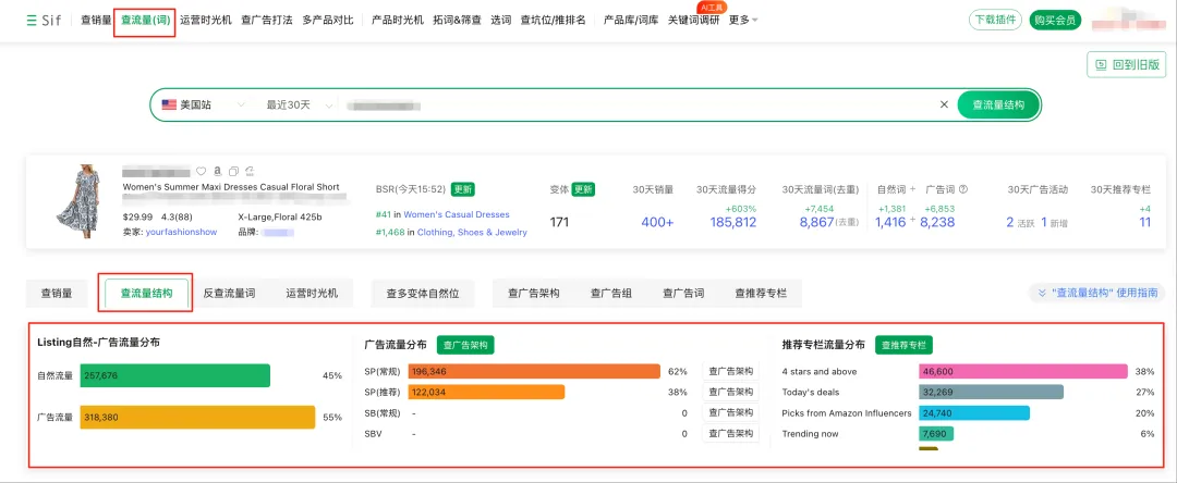 通过Sif 查流量结构,可以看到这款产品的流量分布:最近30天广告流量占比55%,自然流量占比45%,新品阶段以广告为主,这个比例对于上架3个月的产品来说是合理的。