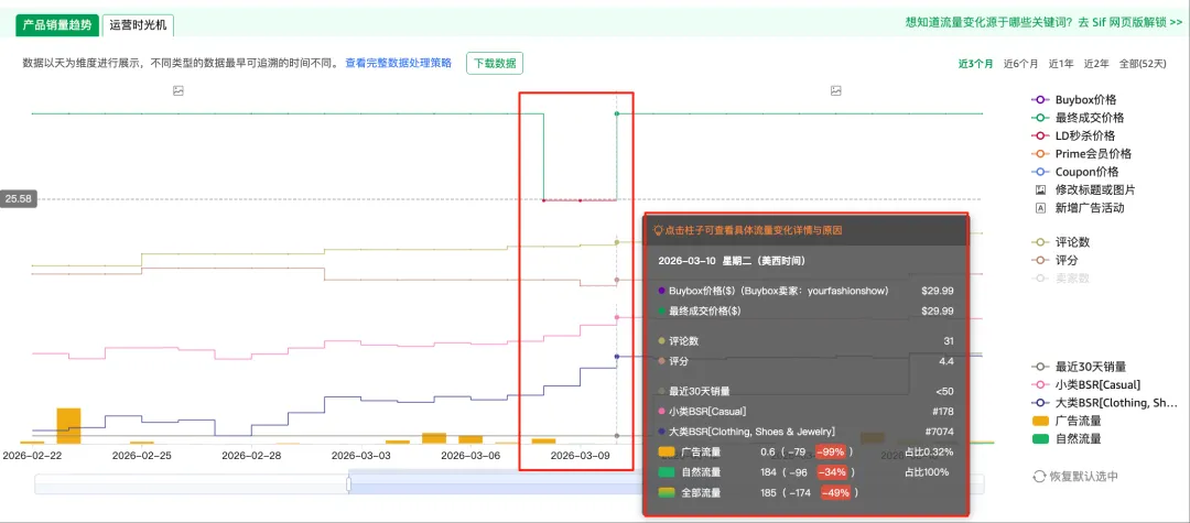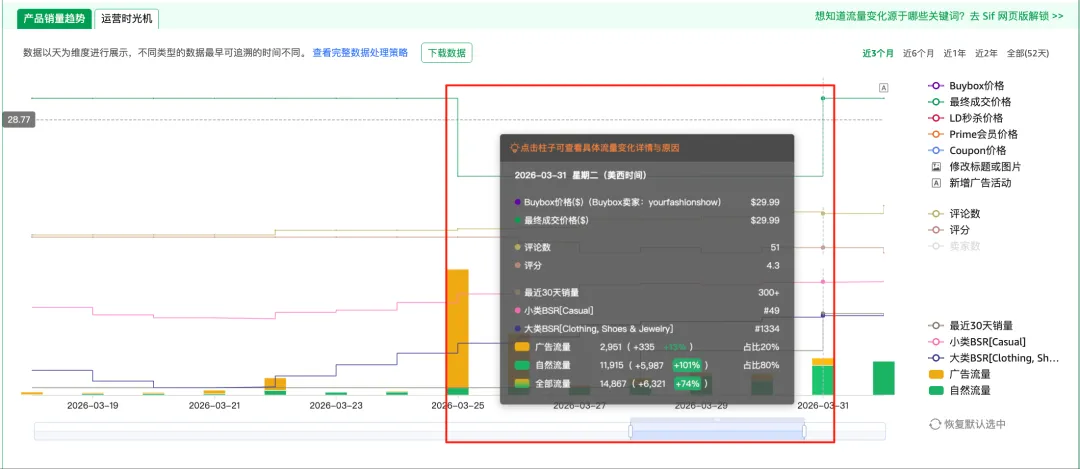 用Sif关键词的运营时光机调出这款产品的历史价格和排名走势,两个重要节点非常清楚。