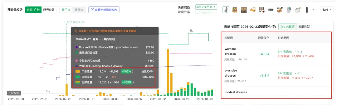 这款产品的某一天自然流量下降了11%,但广告流量有所上涨。