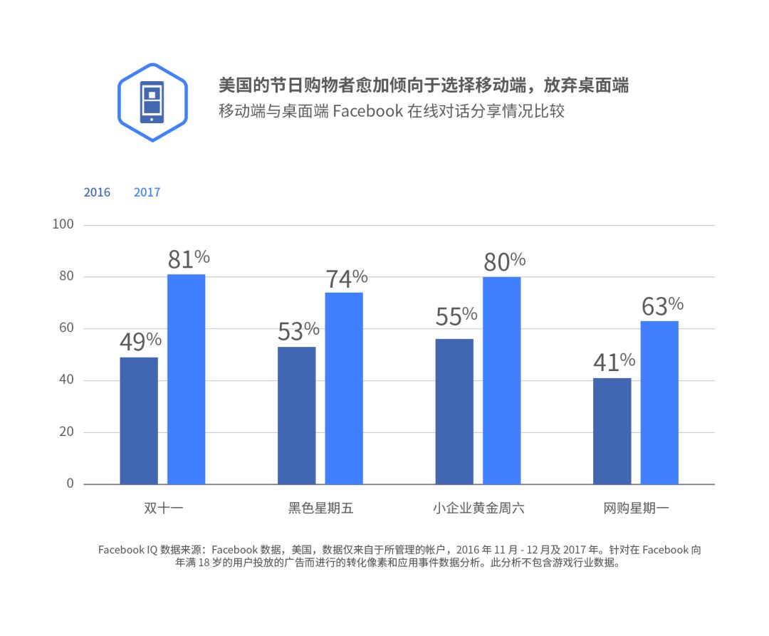Facebook 发现,2017 年在 17 个市场内,相对桌面端,双十一、黑色星期五和网购星期一的移动端在线转化量1分别增加至总体在线转化量的 80%、69% 和 64%。