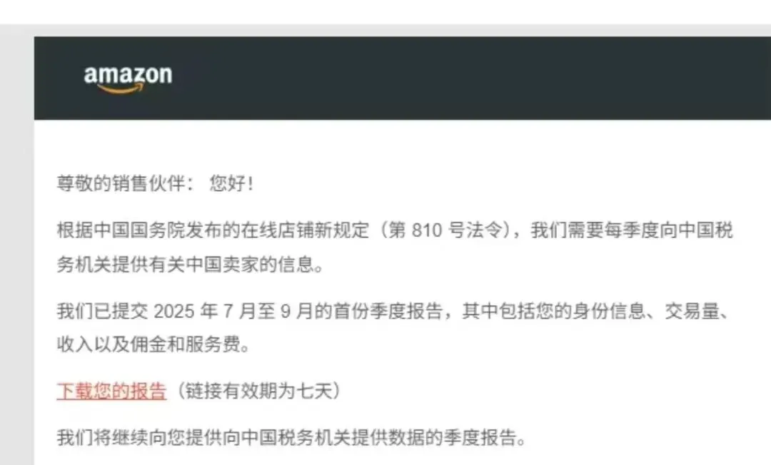 根据中国国务院发布的在线店铺新规定(第810号法令),我们需要每季度向中国税务机关提供有关中国卖家的信息。