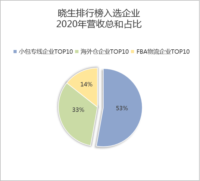 据晓生排行榜对2020年入榜企业年营收总和统计,以小包专线为主营业务的企业,其年度营收总和,在FBA物流、海外仓、小包专线这三大细分领域中,占比已超半壁江山。