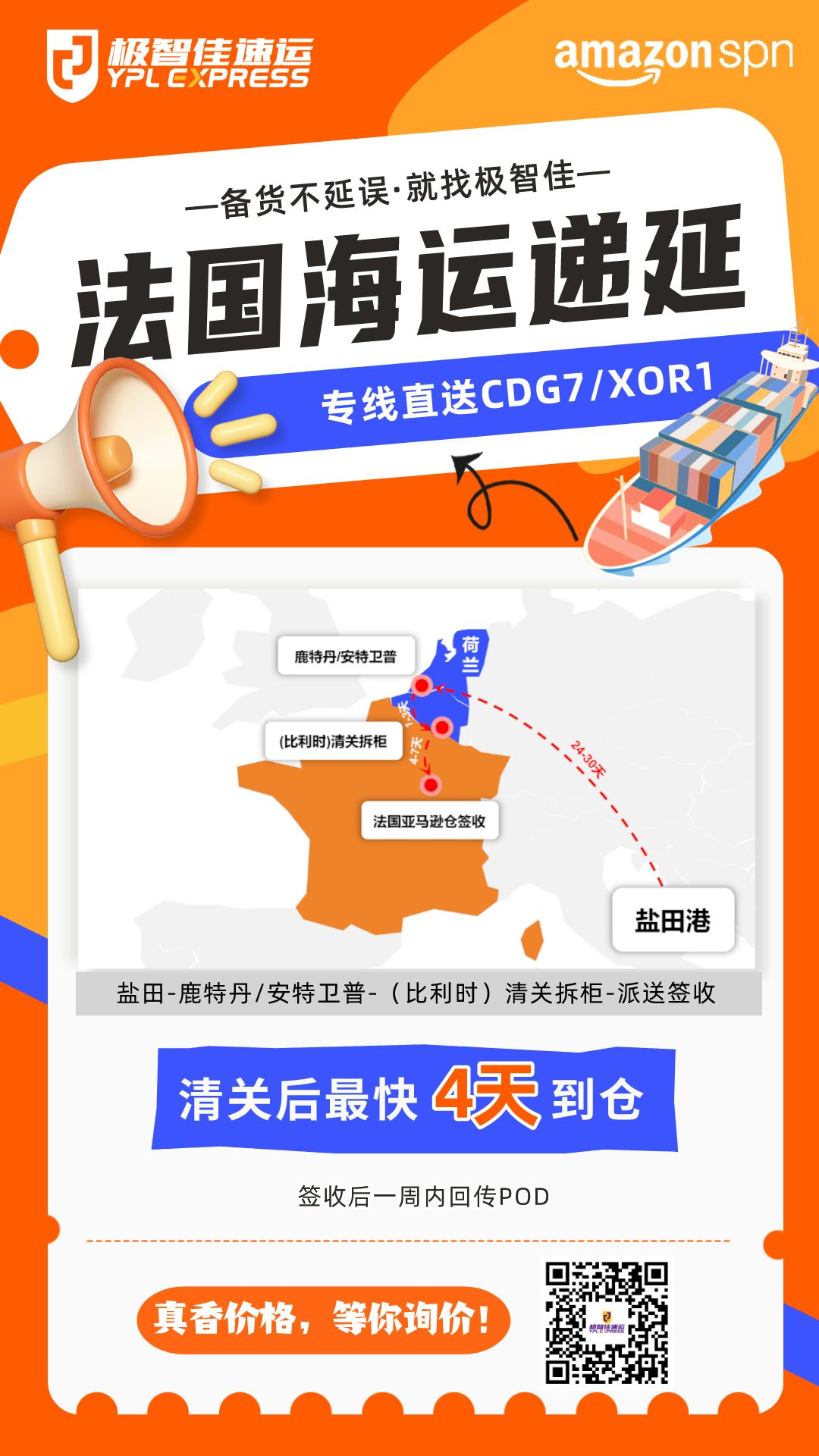 为让中国卖家以更好的优势开拓法国电商市场,极智佳进一步优化法国FBA头程时效及价格,并推出了法国海运递延直送CDG7/XOR1,头程采用OA联盟快船,末端采用卡车直接派送至亚马逊FBA仓。