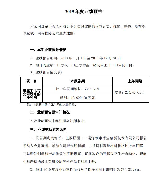 圣诞节前夕,跨境大卖泽宝母公司广东星徽精密制造股份有限公司发布了2019 年度业绩预告 业绩预告期间(2019年1月1日-12月31日),星徽精密盈利1.6亿元,比上年同期增长7727.79%,上年同期盈利204.4万元,并且这个业绩是同向上升的! 星徽精密就业绩变动原因给出了说明 1、报告期利润增长,主要原因: 一是深圳市泽宝创新技术有限公司报告期纳入合并范围,增加公司报告期利润; 二是钢材等原材料价格比上年回落; 三是研发创新和产品质量的不断提高,优质客户的开拓以及生产自动化、智能化和严格的成本费用控制等使产品毛利率上升。 2、预计 2019 年度非经常性损益对当期净利润的影响约为 764.23 万元。 泽宝对星徽精密的净利润贡献确实非常大! 2019年,泽宝业绩承诺为净利润不低于1.45亿元 泽宝2018年营业收入规模突破 20亿元,净利润10,960.43 万,毛利率接近50% 以略微超过的业绩完成了目标,今年泽宝1.45亿的业绩大家觉得能完成吗? 从星徽精密披露的业绩报告来看,2019年上半年泽宝技术实现营业收入1058013371.07元, 实现净利润4900多万元,占公司净利润的85.65% 星徽精密2019年前三季度业绩预告,归属于上市公司股东的净利润前三季度预计达到9500万元 根据这些已有的数据,第四季度的利润也就不难算出来,为6500万,第四个季度是跨境电商的旺季,泽宝本来就是跨境的大卖家,之前网一的时候,有传泽宝的四个大号销量32000单…… 因此实现1.45亿的业绩,小邦觉得还是很有可能的!具体的情况还是要等星徽精密公布具体的年报数据我们才能知道 今年大家都觉得做跨境电商越来越难,大麦的业绩也从某种程度上给了我们一些信心,完成净利润一个多亿的业绩确实不是一件容易的事,我们普通卖家没有这个压力,撸起袖子使劲干就是了!