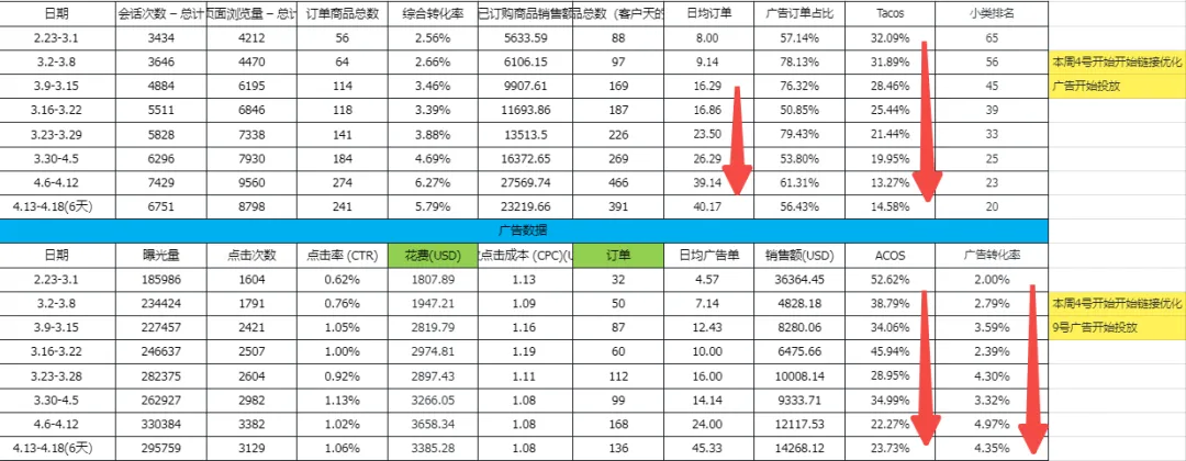 Listing和定价调整大概用了3到5天完成,之后才正式落地广告优化。