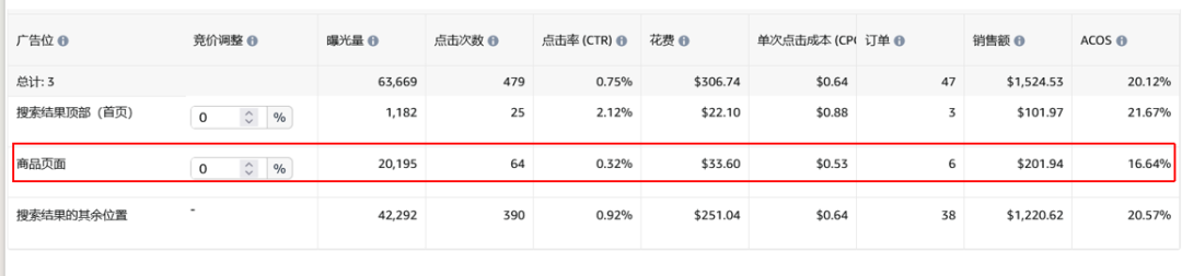我们可以通过对“搜索结果顶部”和“商品页面”位置的出价百分比的调整,使广告最终落地在相对应的广告位置上。