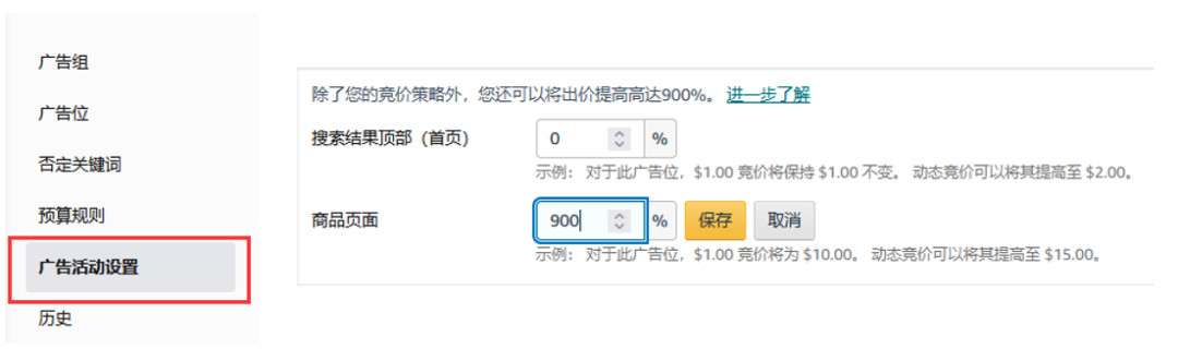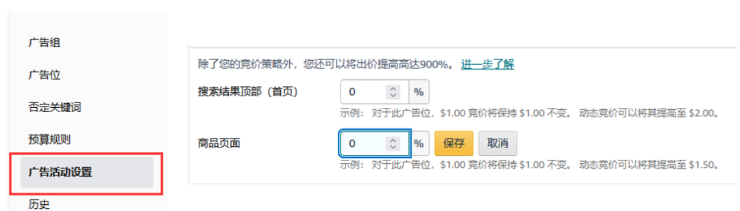 & 第1步:首先在广告活动设置中,将商品页面的位置竞价,由900变为0;