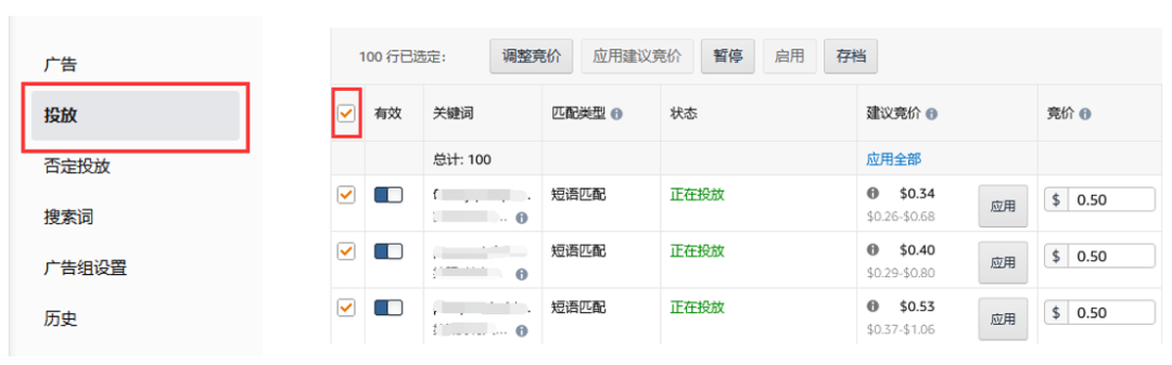 & 第2步:在广告组设置中,点击投放,然后全选关键词