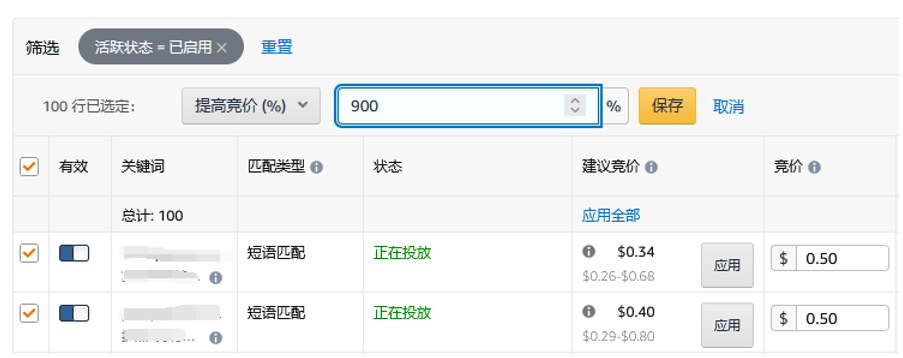 & 第4步:这次我们选择提高竞价(%),在百分比中输入900,这样,竞价就会批量变为10倍,从而又恢复到了原来的竞价。