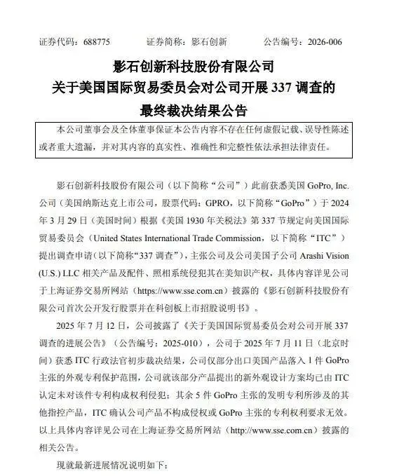 但在 2026 年 2 月,美国国际贸易委员会最终裁定,GoPro 提出的五项技术专利主张均未成立。委员会认定相关专利要么无效,要么不存在侵权,Insta360 的产品可以继续在美国市场销售。换句话说,这家深圳企业在全球最严格的知识产权审查体系中,赢下了一场持续两年的专利战。