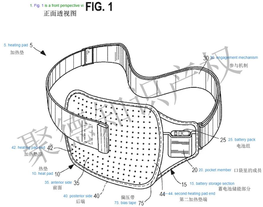 英文 A heating pad comprising: a heat pad including an anterior side and a posterior side, the heat pad comprising: a first layer on the posterior side of the heat pad;a second layer having a wire, the wire being capable of being selectively heated to increase the temperature of the heat pad; a third layer comprising a reflective material positioned to reflect heat from the second layer towards the first layer,thereby decreasing the amount of heat emitted on the anterior side of the heat pad; and the third layer being located further towards the anterior side than the first and second layers, the second layer being located in between the first layer and the third layer of the heat pad; a battery being in electronical communication with the wire of the heat pad; and an engagement mechanism to secure the heating pad to a user. 译文 加热垫包括: ● 热垫,包括前侧和后侧, 热垫包括: 位于热垫后侧的第一层; ● 具有金属丝的第二层,该加热丝能够被选择性地加热到提高热垫的温度; ● 第三层包括反射材料,用于反射来自第二层朝向第一层,从而减少散发的热量热垫的前侧,第三层比第一层更靠近前侧,第二层位于第一层和第三层之间; ● 电池与热垫的金属丝进行电连通,还有一个接合机制,用于将加热垫固定到用户。 要求12 英文 译文 加热垫包括: ● 热垫包括皮肤接触层、加热层和反射层; ● 加热层包括穿过加热层的金属丝; ● 金属丝选择性地加热加热垫,其中来自加热层的热量由反射层向用户反射; ● 与第二层中的金属丝进行电连接的电池,所述电池是加热垫的电源。