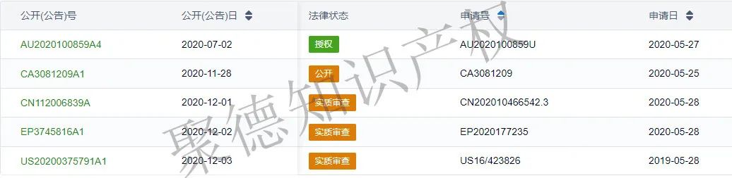 目前,SUNBEAM PRODUCTS, INC申请了与上述产品相关的专利:US20200375791A1,并且以该专利为优先权,分别在澳大利亚、加拿大、中国、欧洲布局了专利申请,申请国家及进度如下图所示: