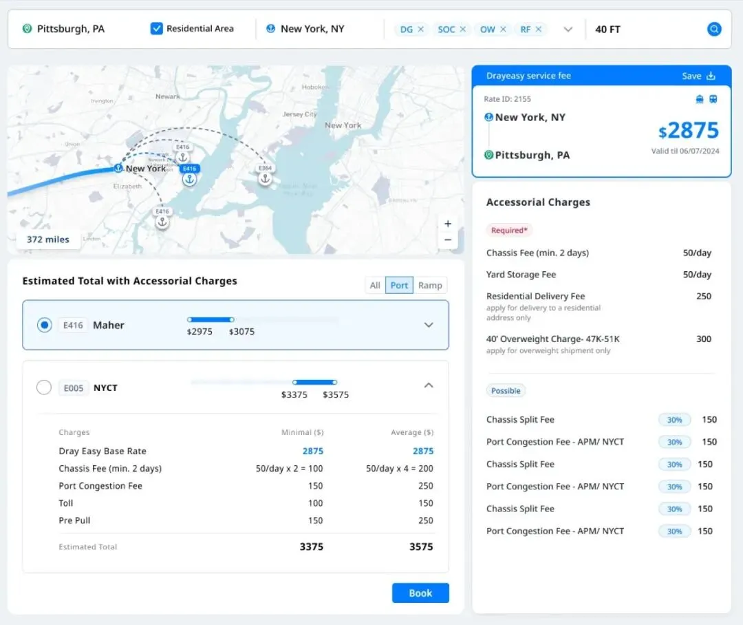 Wayne Ran: 我们提供的运价已经过DrayEasy标准化处理,会实时分析所有承运商的运价数据。美国卡车行业有5000多种不同计费码,我们只提取20个高频出现的进行定义,展示在客户平台上。客户不管查哪条路线,只要输入目的地邮编,1秒就能获取标准化运价,背后有100多家卡车公司支撑,覆盖全美国150万条路线,效率很高。