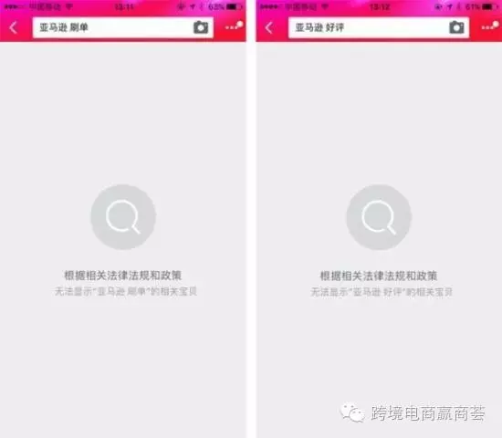 其中,有一部分这类服务的提供商就驻扎在淘宝平台上。这类行为近年来已经引起淘宝的注意。目前,在淘宝用关键词组合搜索“亚马逊+刷单”或“亚马逊+好评”,都会遭到自动屏蔽。