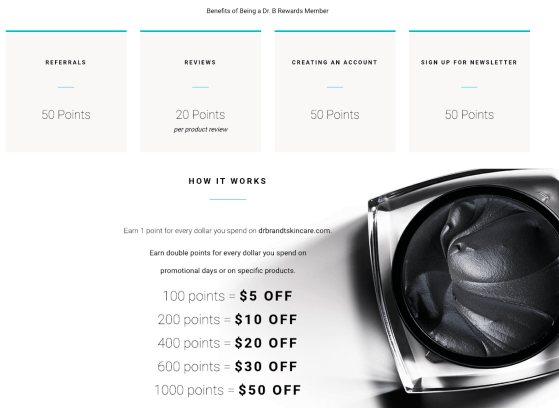 护肤品 DTC 品牌 Dr. Brandt 很好地运用了奖励兑换的逻辑。消费者可以通过完成各种活动来获得积分,比如通过购物或者写评论的方式。消费者可以用他们挣得的积分来获得折扣。