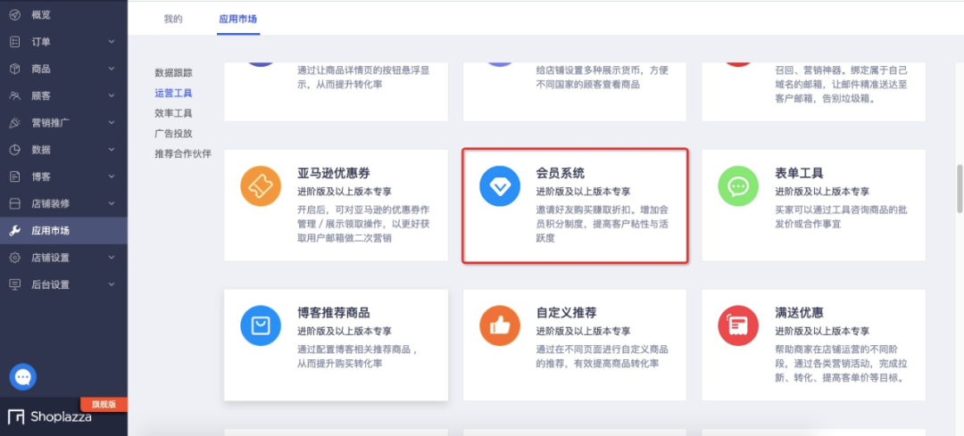 (进入 Shoplazza店匠 后台「应用市场」轻松找到「会员系统插件」)