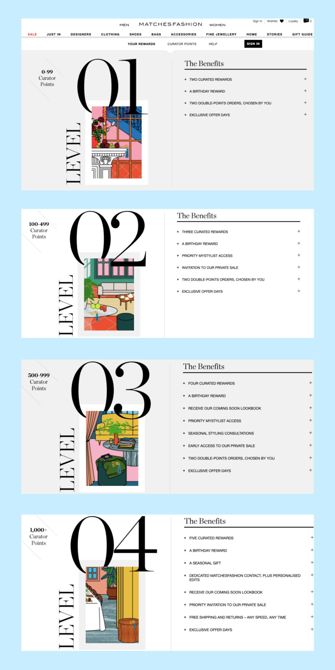 作为现代奢侈品购物胜地, MATCHESFASHION 为了满足该 DTC 品牌高标准的消费者需求,设置了分层计划。该计划分为四个等级,消费者可以通过保持高消费来获得新的排名。不仅奖励的质量随着等级的提高而增加,而且福利和独家服务的数量也随之增加。