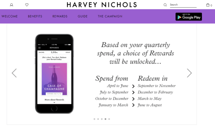 Harvey Nichols 的会员营销方式设法克服了上述挫折。每三个月,每个消费者都可以从奖励池中兑换礼物。但是有一点特别的是:每个消费者的季度支出都会影响可兑换的奖励情况。