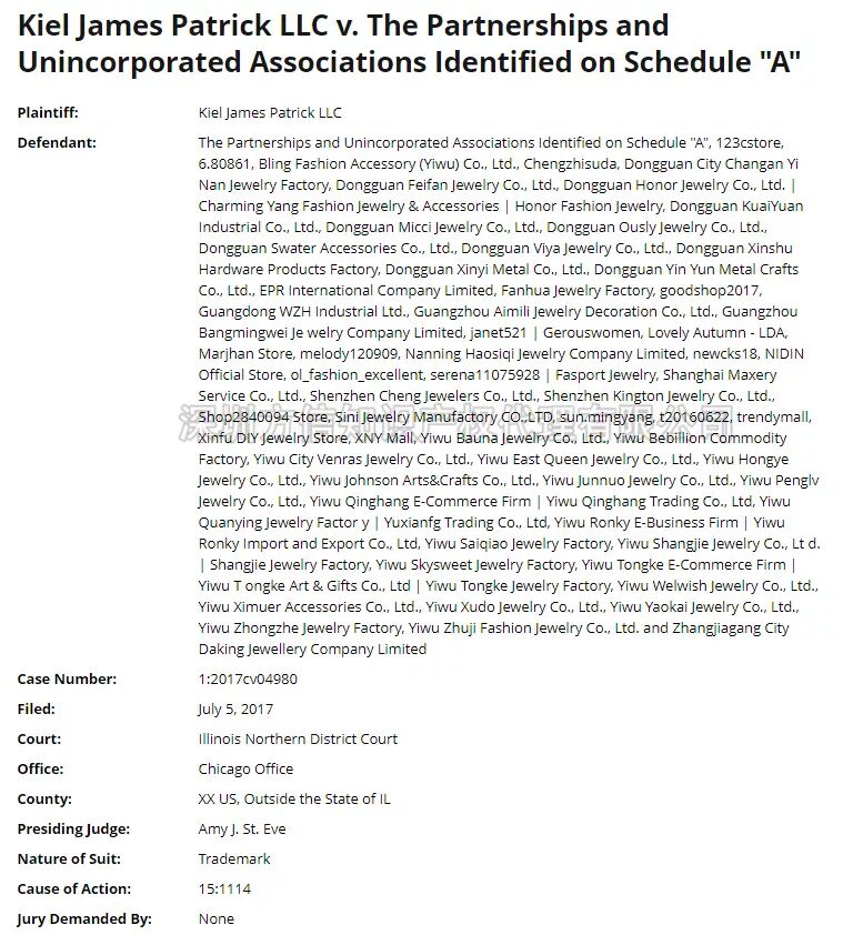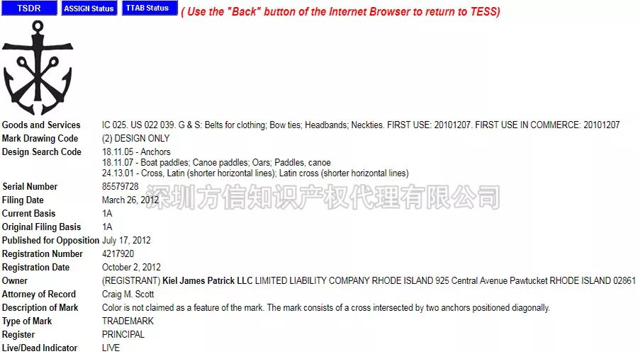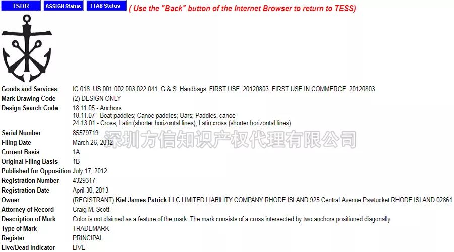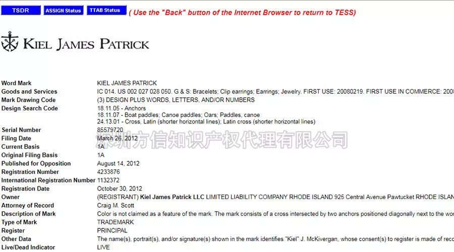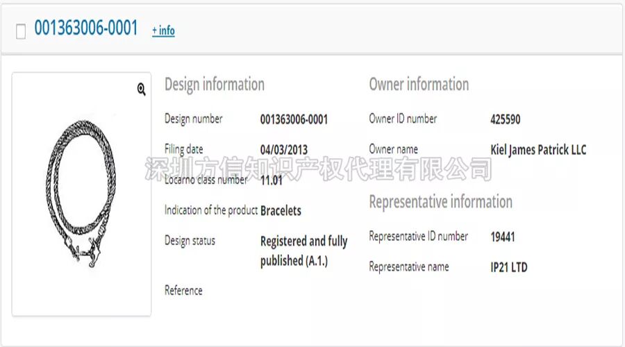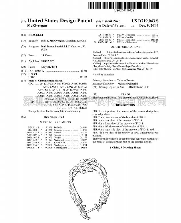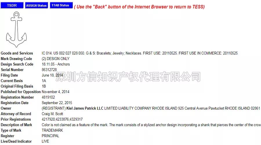 船锚手链 Anchor Bracelet 很早就面市了但是依然热卖的首饰品 却有卖家被告知侵权冻结账号 这是怎么回事? 时尚潮流的你,一定对这款“船锚手链”有所耳闻。 这个手链算不上新产品,在2012年刚刚上市的时候,就俘获了不少年轻人的心,时至今日依旧有不少人青睐。 爆款从来都不少仿品,船锚这个元素也不列外。在2016年,eBay平台一度对侵权的船锚手链饰品进行严格的查封。最近,有在平台上销售船锚手链的卖家反映自己的PayPal账户被冻结了。小编毫无疑问是个好奇宝宝,总是希望知道事情的真相,便查了船锚手链的相关资料。 通过万能的网络世界,小编确认了Anchor Bracelet这款手链,最早在2012年上市,其设计和制造来自美国的吉尔詹姆斯帕特里克有限责任公司(Kiel James Patrick LLC )。根据小编收到的消息,卖家账号被冻结,是因为商标侵权。 那么商标是一个什么情况呢? 船锚的图案在2015年9月份在美国获准注册。 (美国商标 No.86312728 14类首饰) Kiel James Patrick LLC 在2008年成立,主要经营手工首饰,手工包包和服装。除了上面的船锚图案,Kiel James Patrick LLC 还申请了哪些商标呢? (美国商标 No.85579720 14类首饰) (美国商标 No.85579728 25类服装) (美国商标 No.85579719 18类箱包) (欧盟商标 No.009331125 14&18&25&35类) (欧盟商标 No.009331141 14&18&25&35类) (欧盟商标 No.009331158 14&18&25&35类) 那么, 一直关注我们的你,肯定也学习到了不少! 这时候你就会问: 那么他们是否拥有什么专利呢?特别是主角 “船锚手链” 是否存在外观专利呢? (美国外观专利 No.D719043 船锚手链) (欧盟外观专利 No.001363006-001 船锚手链) 由上面的图片我们可以知道,船锚的图形在美国注册了商标,船锚手链在欧盟和美国也都申请了外观专利,并分别在2013年和2014年获得授权。如果在eBay或者Amazon等平台销售类似产品的卖家,可能需要注意“船锚手链”不仅仅是商标侵权那么简单,还可能会涉及外观专利侵权,尤其是销往欧盟和美国地区。 “船锚手链”流行之后,仿品也随之而来。 那么,如此注重知识产权保护,早早把商标专利全申请了的 Kiel James Patrick LLC 会怎么做呢? 在2016年6月正式以专利和商标侵权起诉了一家美国公司和工厂。 2016年8月,Kiel James Patrick LLC第二次提出诉讼,这次诉讼的被告中有一家东莞公司。同年九月,Kiel James Patrick LLC开始对eBay平台上销售船锚手链的仿品进行反击。 在刚刚过去的2017年里,Kiel James Patrick LLC针对船锚手链的商标侵权前后提交了3次诉讼。2017年1月的案件,被告中有一家深圳公司;2017年7月,被告涉及东莞,深圳,广州、义乌和南宁地区的公司和其他平台账号主体。 看到这里,相信大家都已明白, 船锚手链 是一个在知识产权方面保护的可以说十分全面的一个产品了, 去触犯他人的知识产权无疑是不明智的选择! 但是, 如果你的船锚手链并不是抄袭模仿, 也是原创设计,有你自己的设计灵感和理念,你也可以请专业的律师去和JKP进行答辩。 当然,吃一堑长一智, 如果你有自己原创的设计, 你应该在销售前便开始保护你的知识产权,而不是在被侵权或被告侵权后再做出被动性的应对。 在不存在自身的商标和专利的情况下, 向电商平台做出申辩是十分无力的 ---尼古拉斯·方信·元鱼
