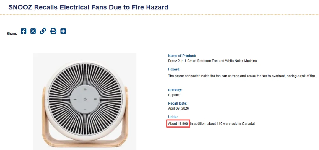 近日,美国消费品安全委员会(CPSC)宣布紧急召回Snooz公司旗下Breez系列电风扇,原因是风扇内部的电源连接器会腐蚀并导致风扇过热构成火灾风险,召回数量多达11900件。