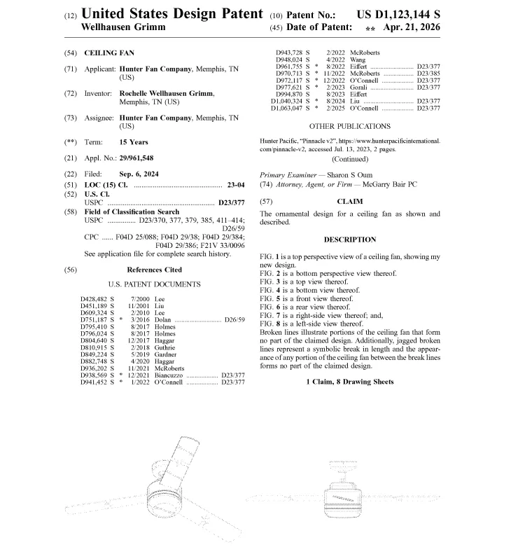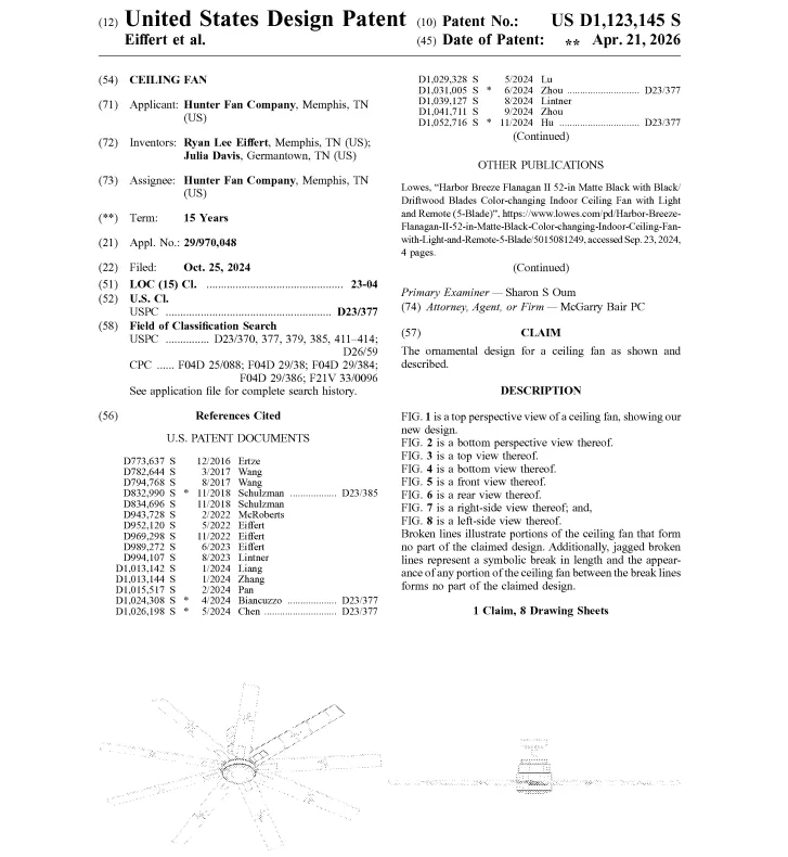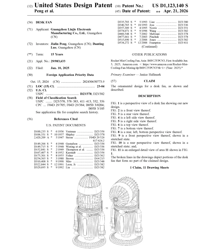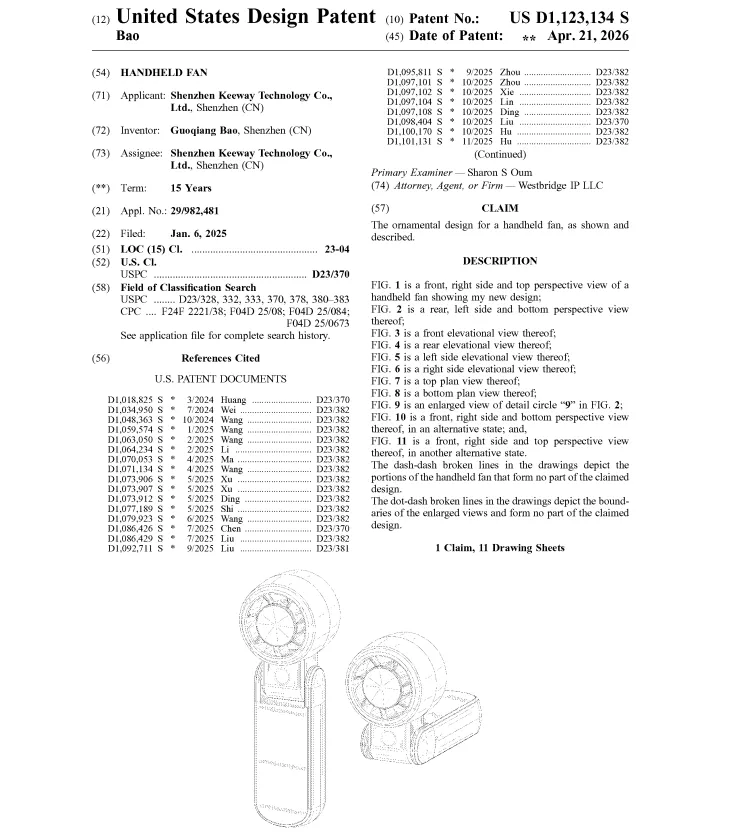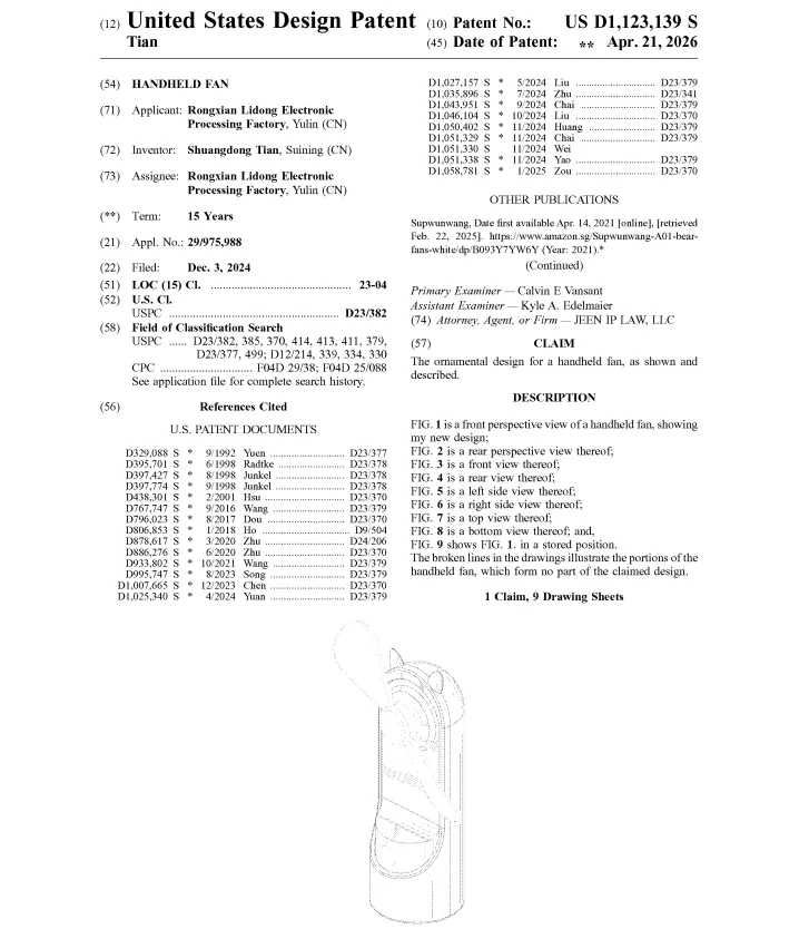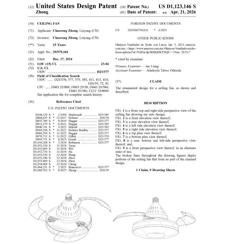 除安全问题外,风扇卖家还要小心外观专利侵权。查询发现,风扇的美国外观专利非常多,美国专利局在4月21日公布的最新下证专利中,就有不少风扇外观专利:
