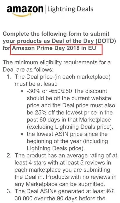 Prime Day是安排在7月份,一般在5月份开始报名,但是今年2018年各站点(US,EU,JP)Prime Day的DOTD已经可以开始自主提报了,要求如下: