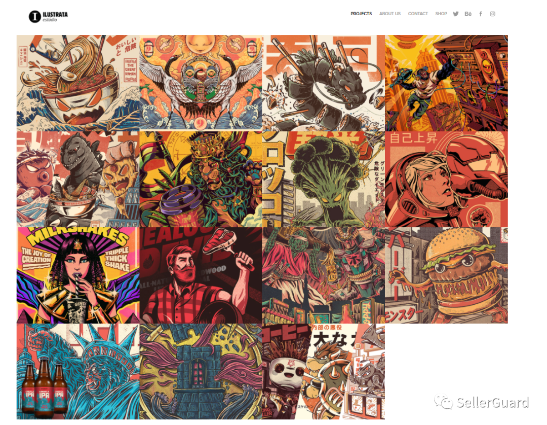 ILUSTRATA 是一家基于巴西的设计插图工作室, 喜欢日本文化和复古的视觉。Ilustrata studio团队的作品极具特色,特别喜欢用复古的褐色,配合日本文化特征的元素,然后加上波普式的噪点。