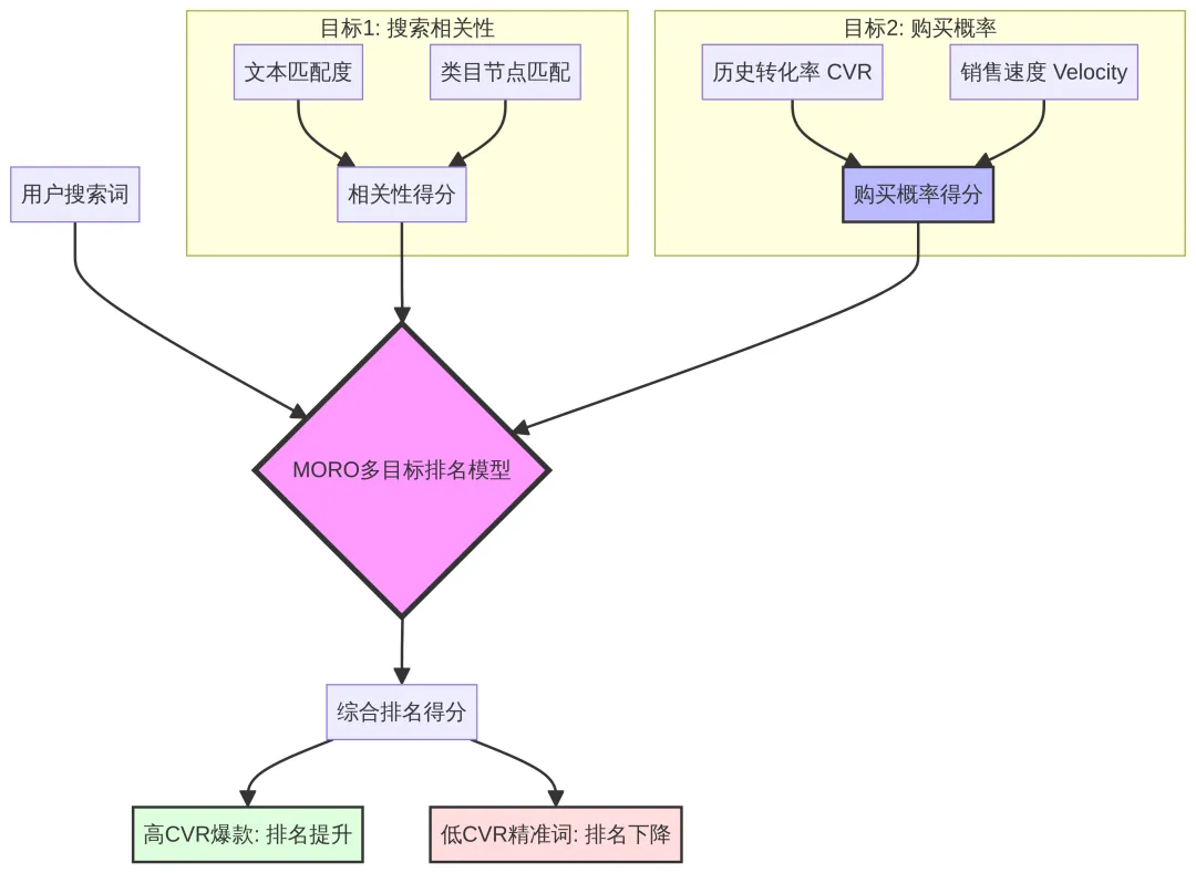 但早在2020年,亚马逊就在The Web Conference上发表了一篇关于多目标排名优化(MORO, Multi-Objective Ranking Optimization)的论文 。虽然是2020年的论文,但这个底层框架至今仍是亚马逊排名系统的核心骨架——后续所有的模型升级,都是在这个"多目标"的基础上迭代的。