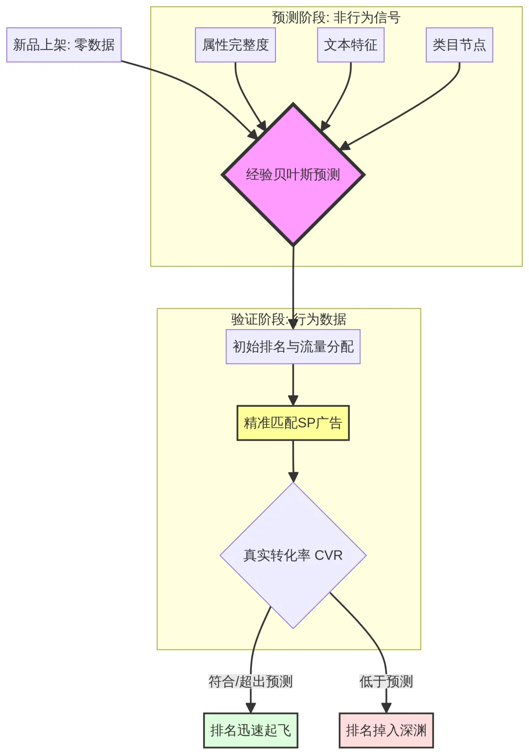 核心逻辑是:既然你没有"行为数据"(点击/购买),那我就看你的"非行为信号"(产品属性、文本特征、类目节点)。系统会参考与你属性相似的老产品的历史数据,来预测你的初始表现。