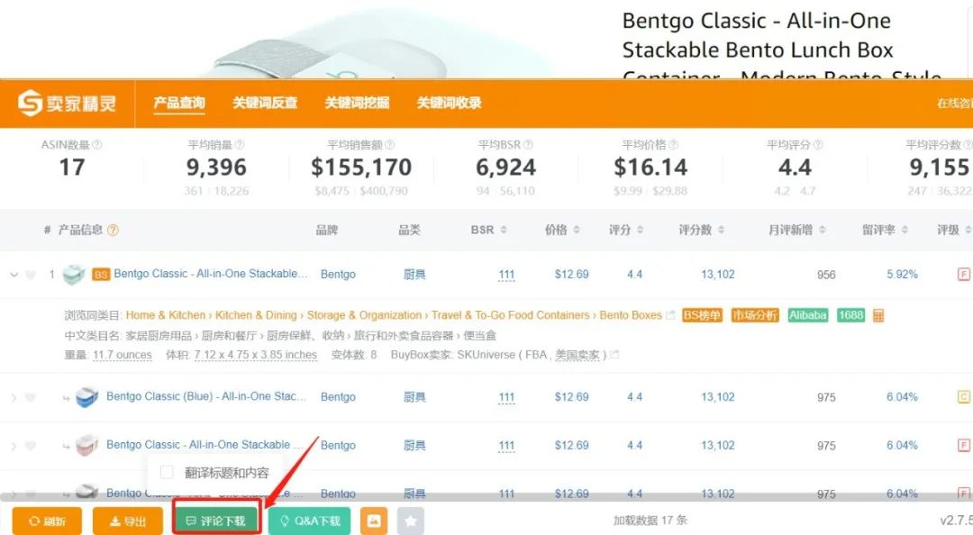 打开卖家精灵插件》产品查询》评论下载,点击即开始下载所有review.