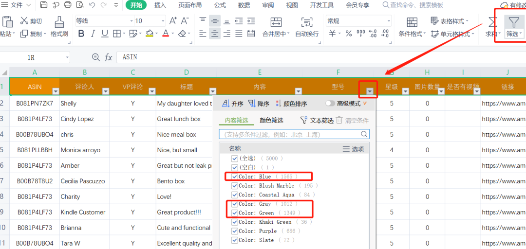 下载完成后,打开excel表格,筛选》型号,即可看到每个颜色对应的review数量。